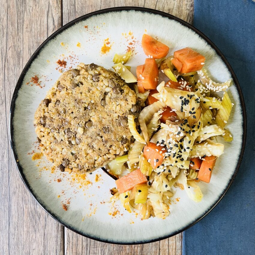 Hamburguesas de lentejas con salteado de zanahoria, apio, repollo y salsa de soja