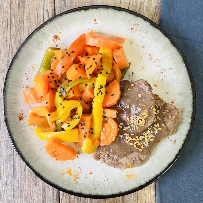Todos / Nuestros platos / Carnes / Lomo en salsa de vino con catara y morrones tres colores