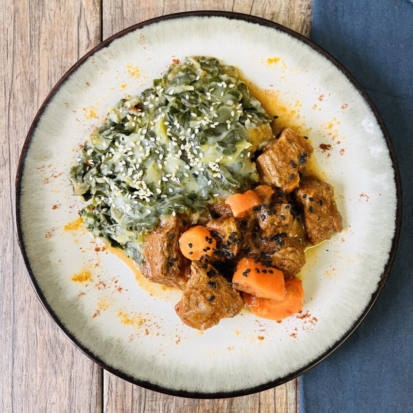 Todos / Nuestros platos / Carnes / Lomo estofado con vegetales y acelga a la crema
