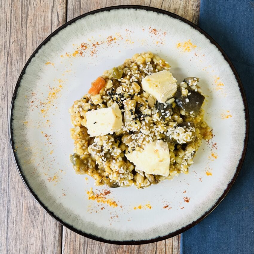 Salteado oriental de vegetales al curry con cebada perlada y tofu marinado en salsa de soja