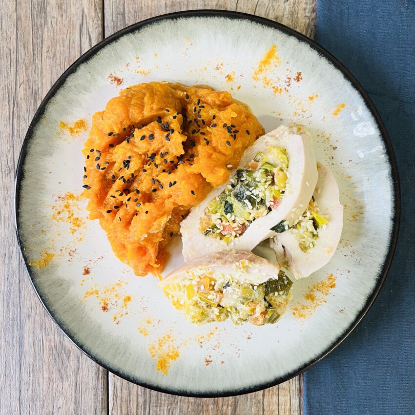 Suprema de pollo rellena con queso y puerros con puré de calabaza